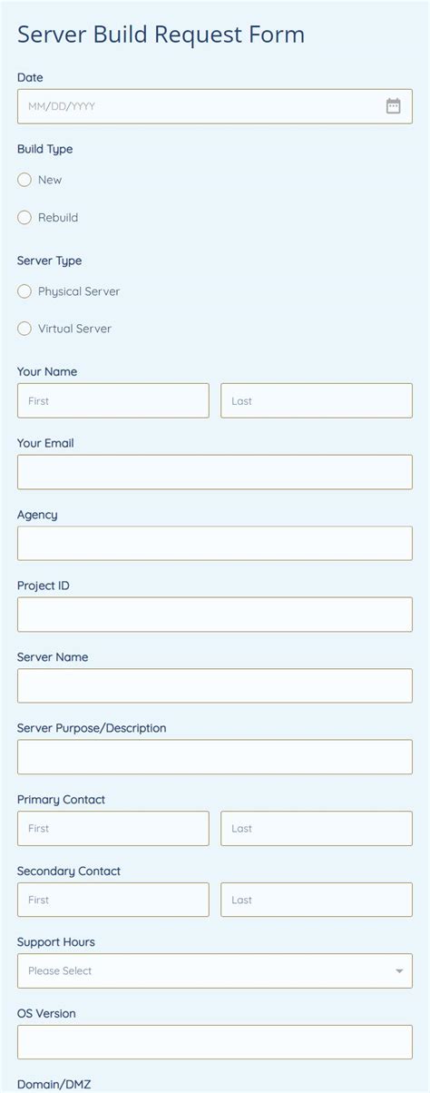 New Server Build Request Form Template - Use this simple it project request form template. Eliminate messy emails or incomplete information. A server request form is a document that describes the server requirements and. Use this server build request form template with typeform now. Simplify server setups with our server build request form template.